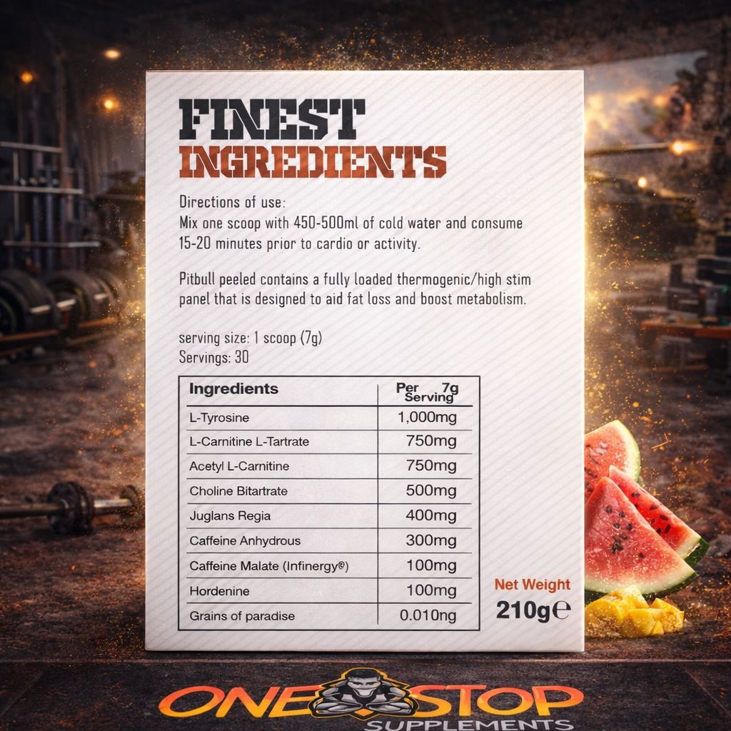 Pitbull Peeled is a fully loaded thermogenic, high-stim fat burner designed for those serious about getting shredded. Whether you’re cutting for a show, leaning out for summer, or pushing for peak conditioning — this formula delivers extreme focus, energy, and fat loss support.