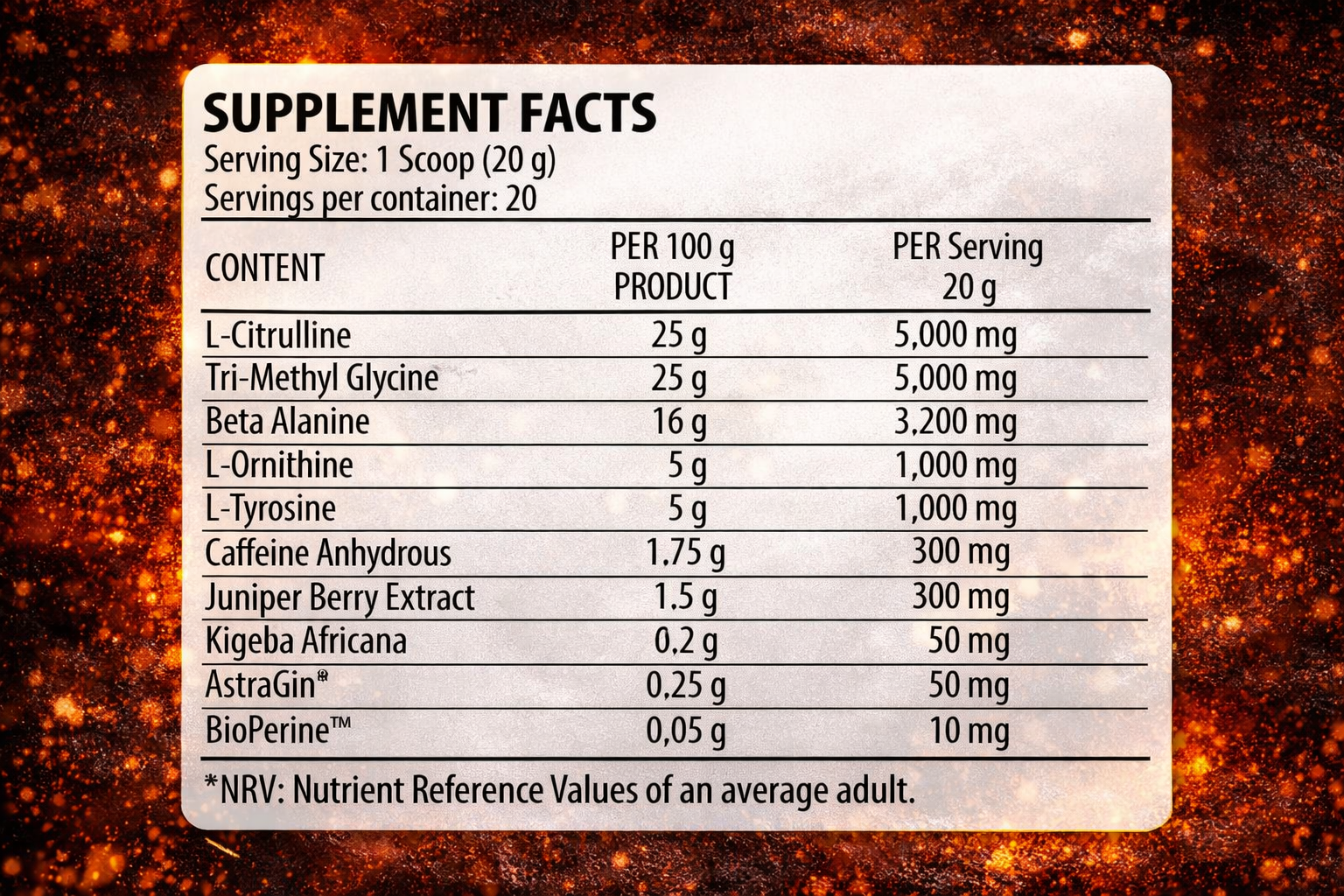 L-Citrulline, Betaine Anhydrous, Beta Alanine, L-Ornithine, Acidity Regulator (Citric Acid), L-Tyrosine, Flavouring, L-Lysine, Anti-Caking Agent (Silicon Dioxide), Caffeine Anhydrous, Juniper Berry Extract, Zynamite, Sweetener (Sucralose), Astragalus Membranaceus Root and Panax Notoginseng root (as AstraGin®), Colouring (E129*), Black Pepper Extract (as BioPerine™).